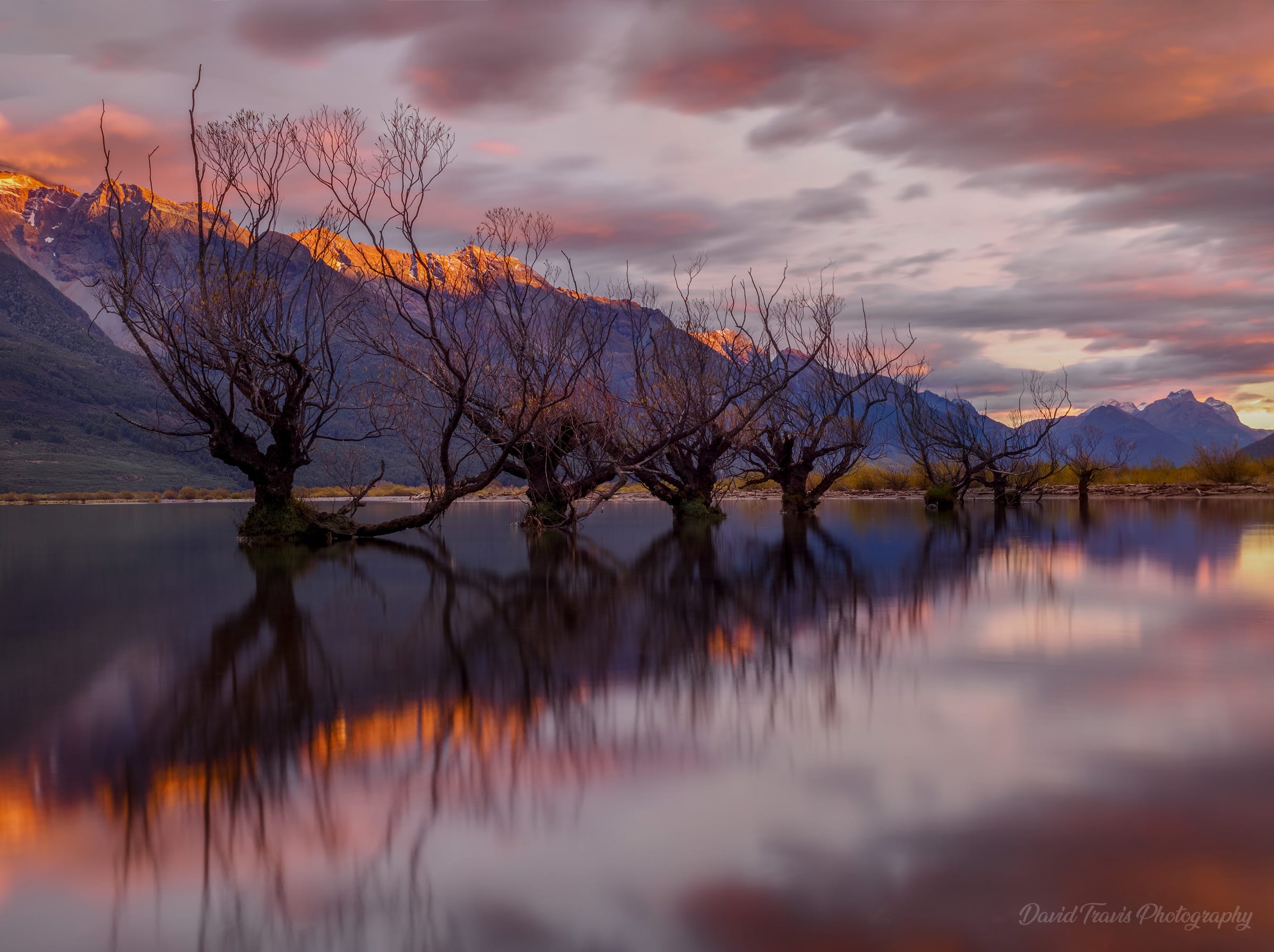 These trees, known locally as the Sisters or Seven Sisters, are to be found just to the right of the wharf at Glenorchy. To get this angle, I put on my wellies and waded out towards the trees. Then it was just a case of waiting for the light to appear (and hoping that the water stayed out of my boots).