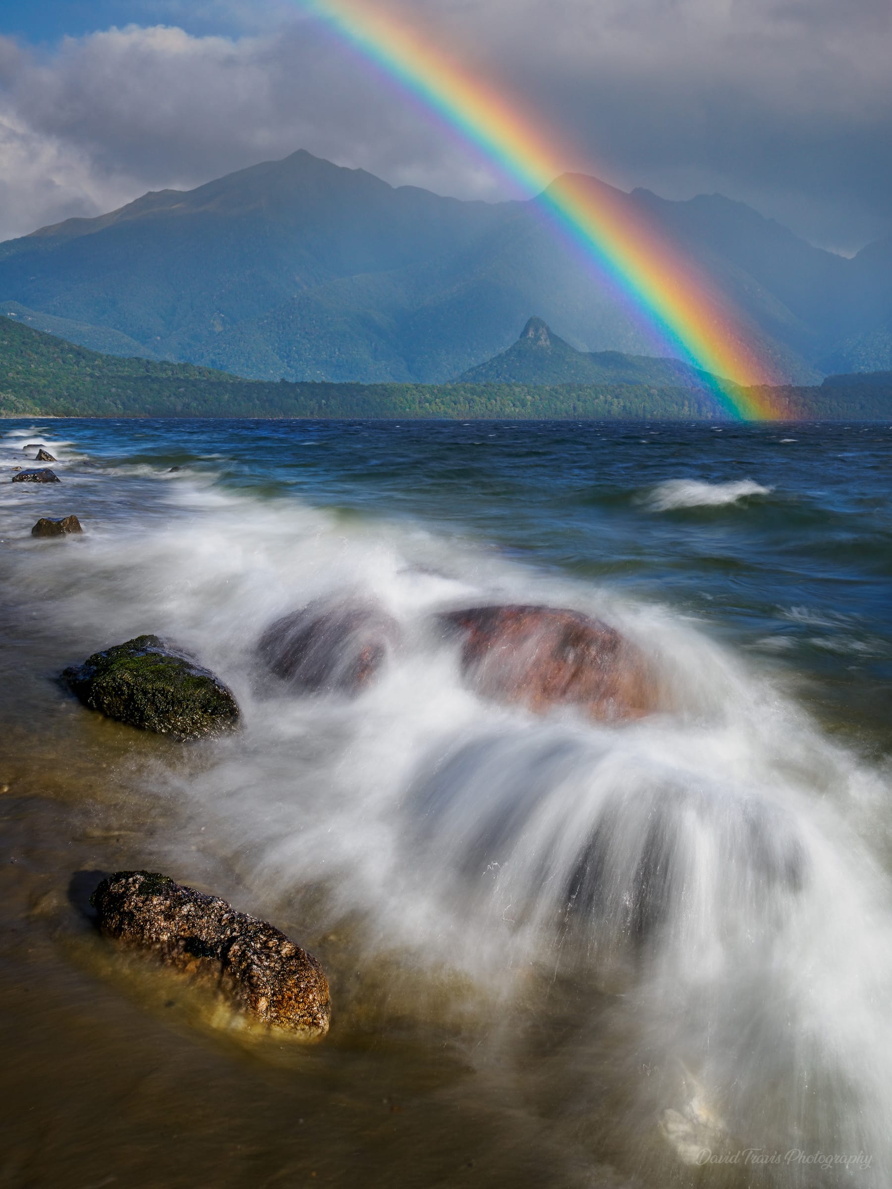 I was near Manapouri when I saw this incredible rainbow in front of me. I knew that there was a nearby beach with interesting foreground as I had been there the evening before. Because rainbows are so transitory, I always find myself working fast. But on this occasion the conditions remained unchanged for long enough for me to fit a polariser to my lens and set my camera on a tripod.