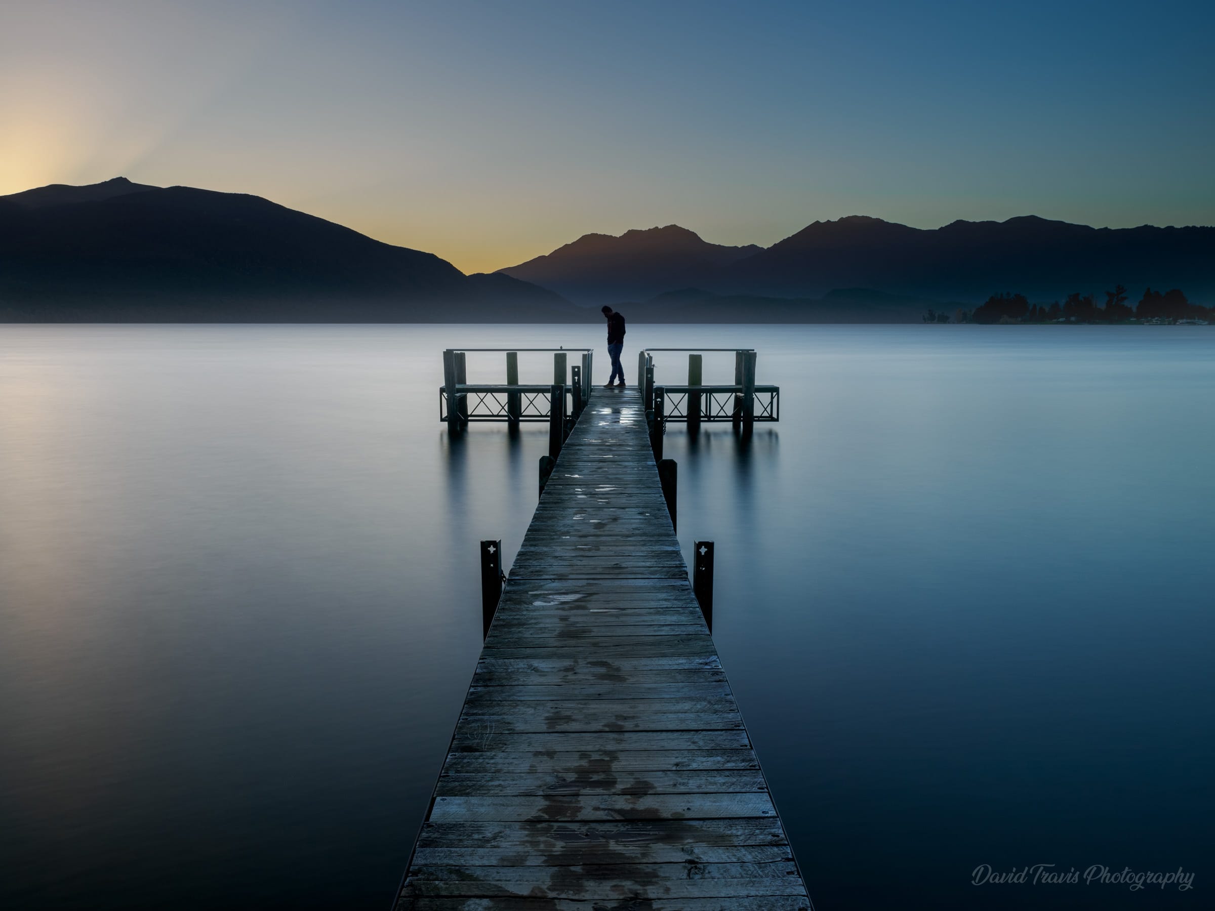 I had seen photographs of Marakura Wharf in Te Anau and wanted to create my own interpretation of it. When I first arrived, I found some swimmers using it and a couple taking a selfie, but as sunset arrived I pretty much had the location to myself. I set up my tripod and took a couple of long exposure shots, but then this person arrived who wanted to claim the location for a family shot. He stepped around my tripod (not an easy manoeuvre as my tripod legs were extended across the full length of the jetty) and waited for his relations to catch up. I took a couple of pictures of him hovering around at the end before giving up on the shot. Back at my computer, I blended his figure into one of my longer exposure images. Although I was frustrated at the time, I think it turned out to be a better picture with a person in it than without.