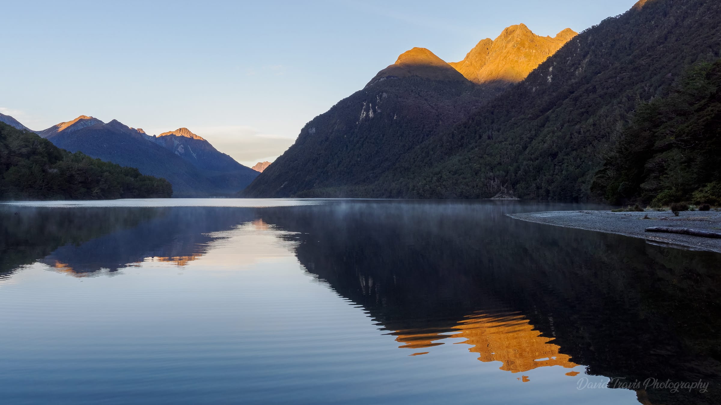 The road to Milford Sound gets busy with visitors as the day wears on, so I made sure to get to this location before the tourist buses. It was quiet; the lake was still and there was mist on the water. I waited for the light to crest the mountain before taking the picture.