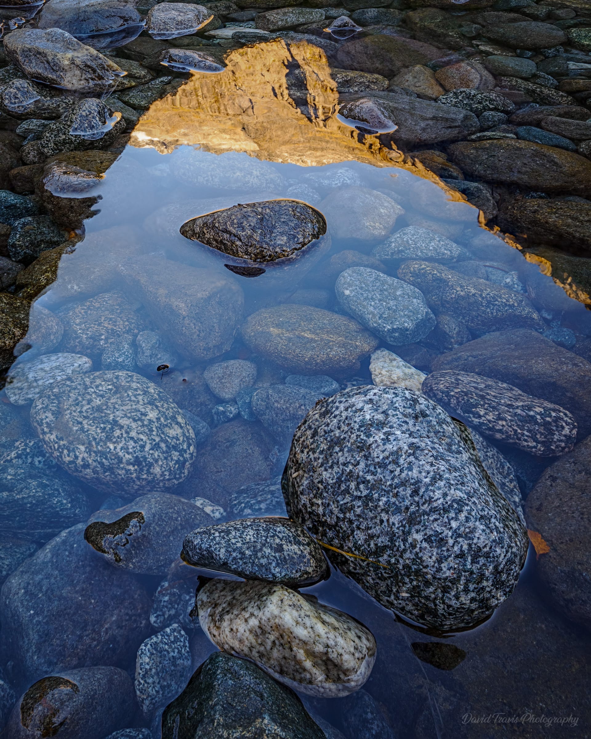 Blue skies aren’t usually conducive to good photography. But there was a crisp light on the nearby mountains and I spotted this reflection in some water. It almost looks like gold leaf.