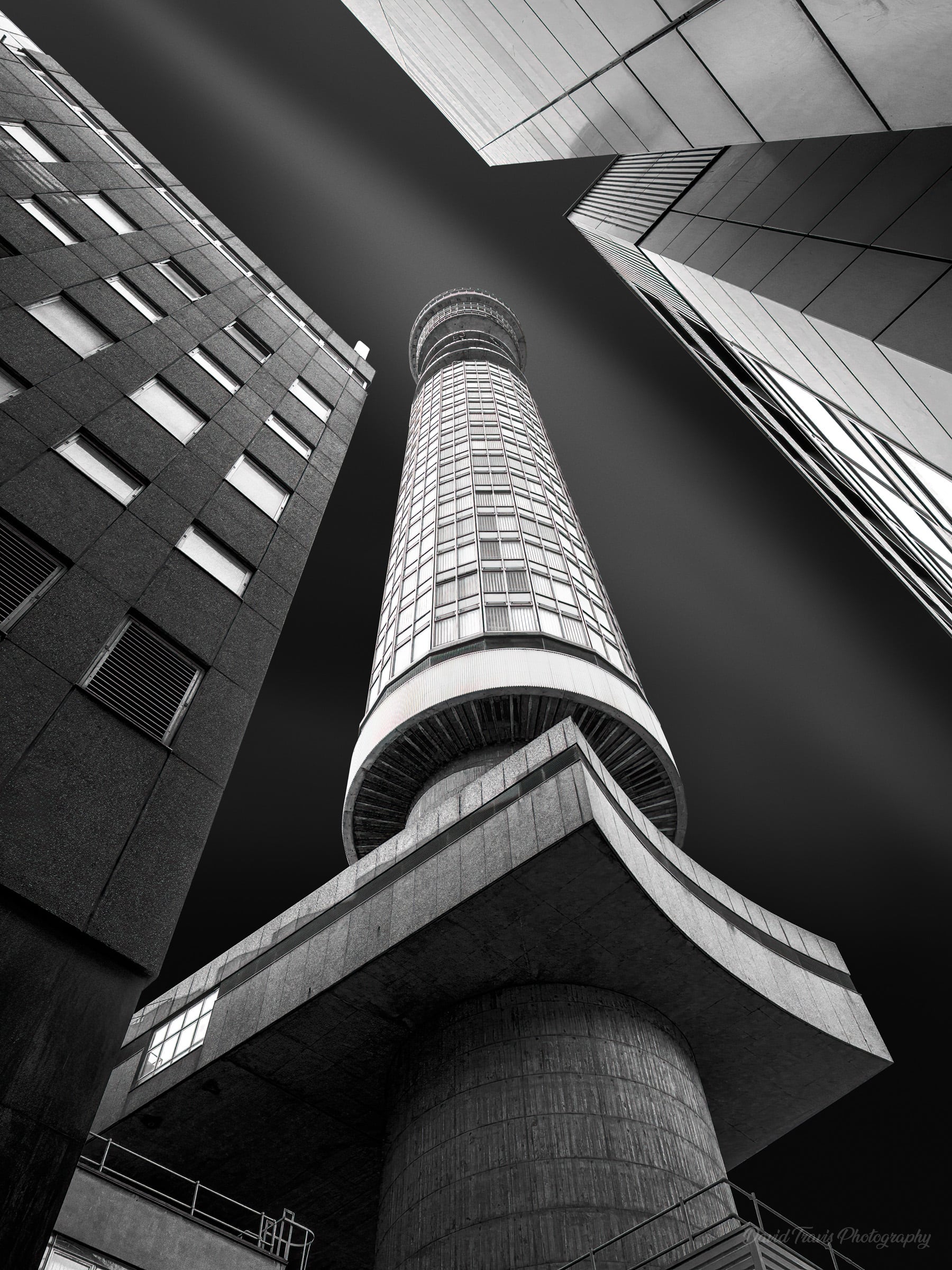 This is a tricky composition to make because the road here is very narrow. On the day I visited, I also had to contend with roadworks that had closed off most of the road and footpath. I like the way that the cylinder shape of the BT Tower contrasts with the boxy buildings that surround it.