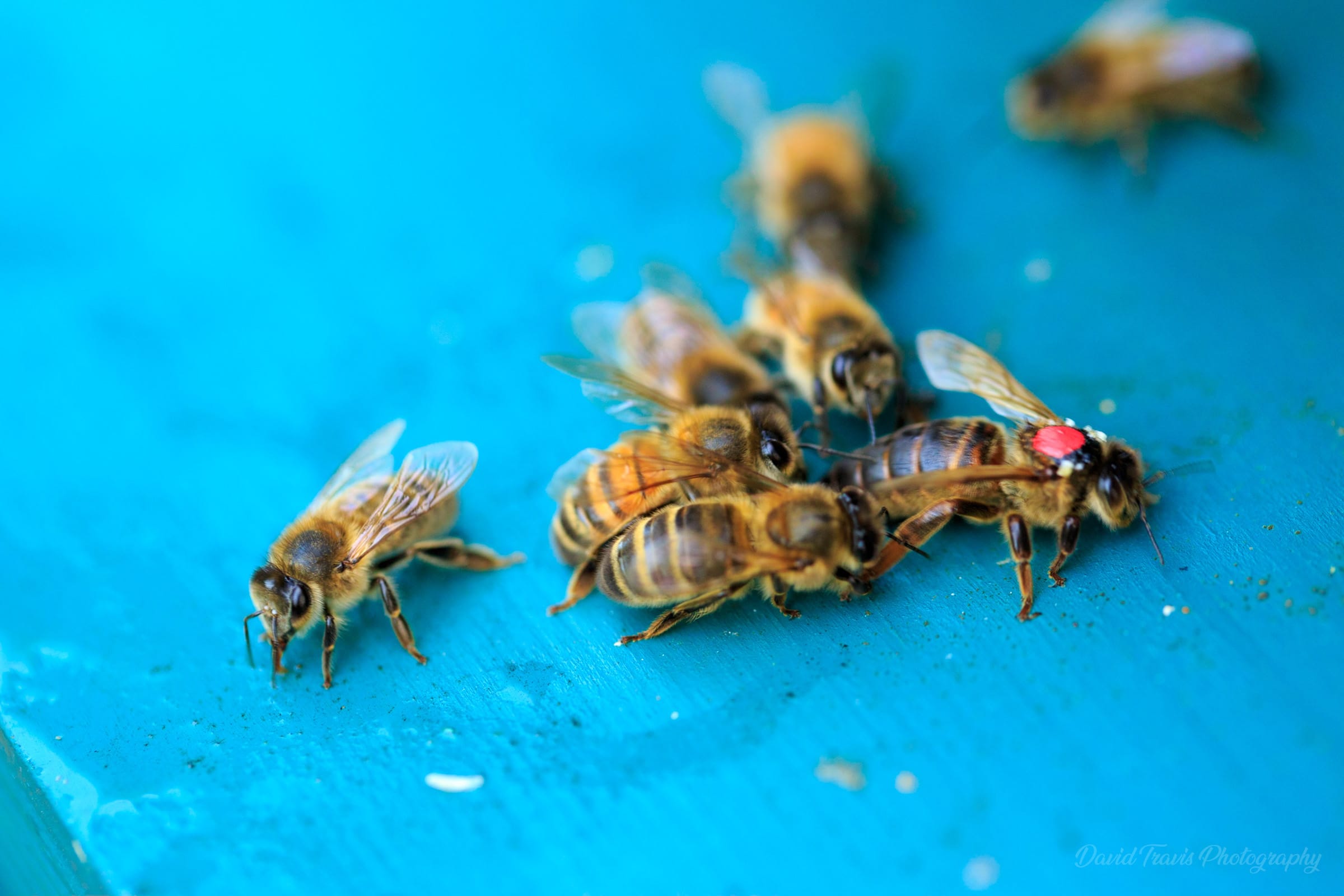 The queen (marked with a red dot) is the only sexually mature female in the hive and all of the female worker bees and male drones are her offspring.