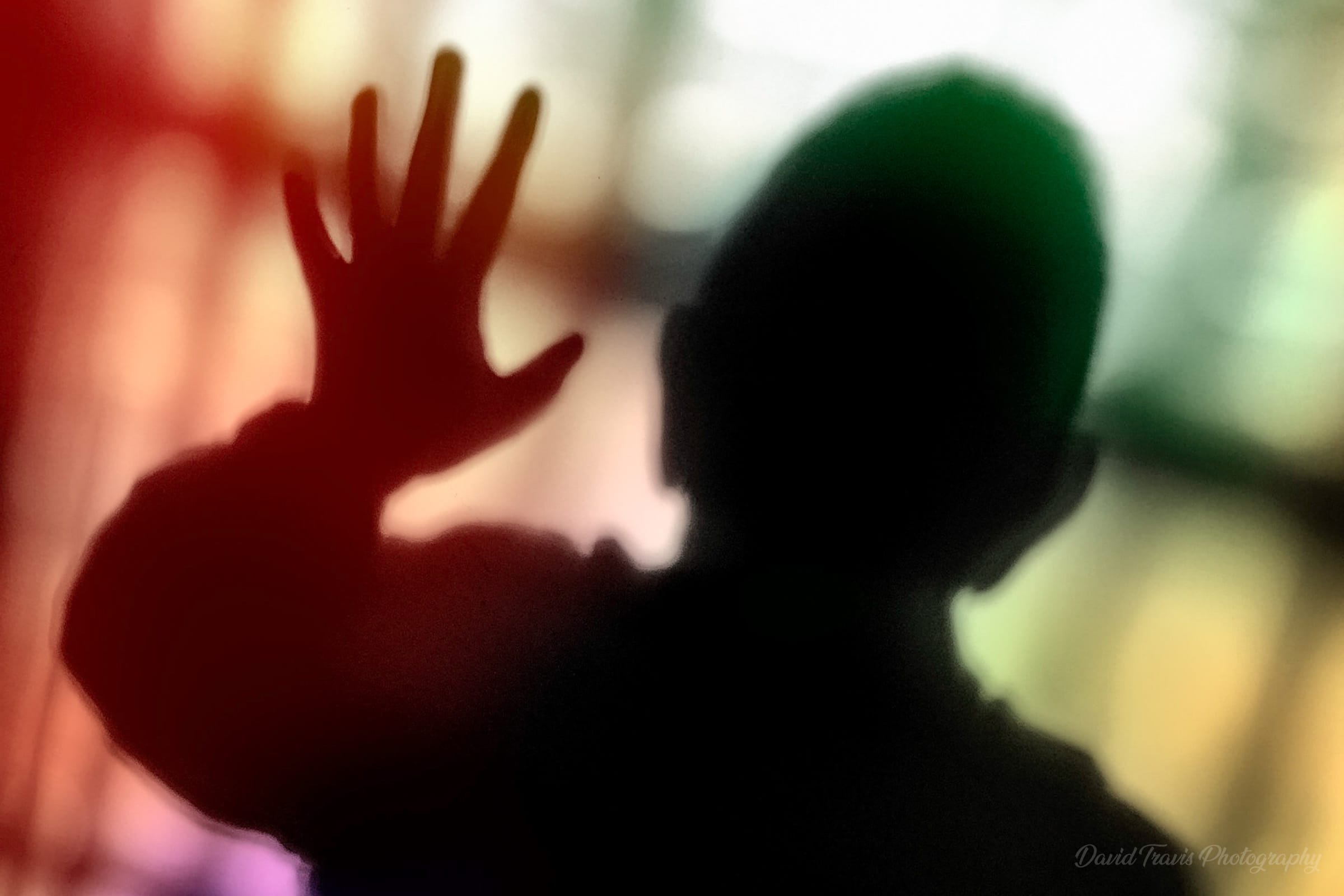 This is a selfie silhouette taken in a hotel room where I stayed in Newcastle. It was ordinary morning light but filtered through coloured windows.
