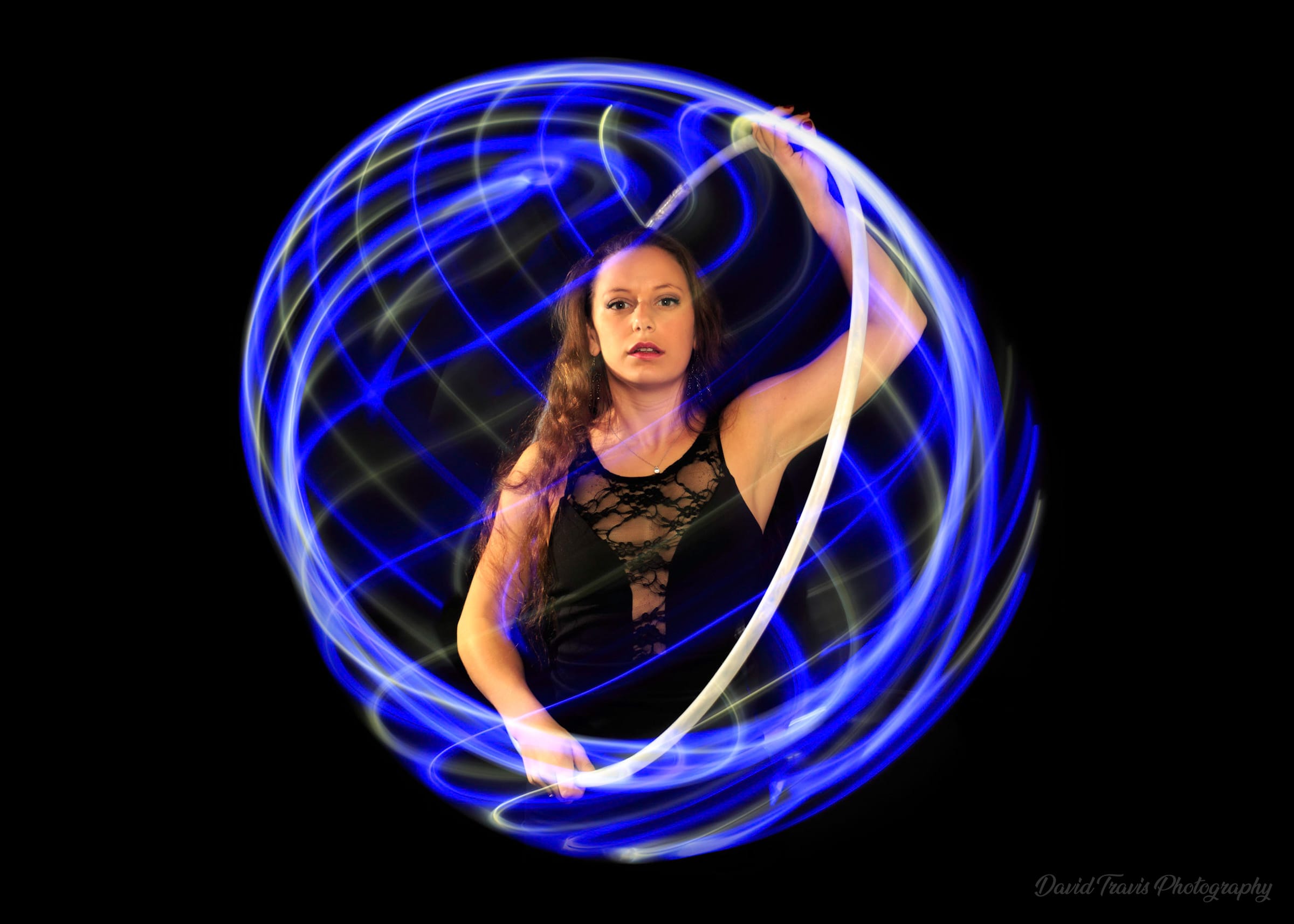 This is hula hoop artist Helen Orford, who comes with her own LED hula hoops. That, plus a soft box, created an interesting portrait.