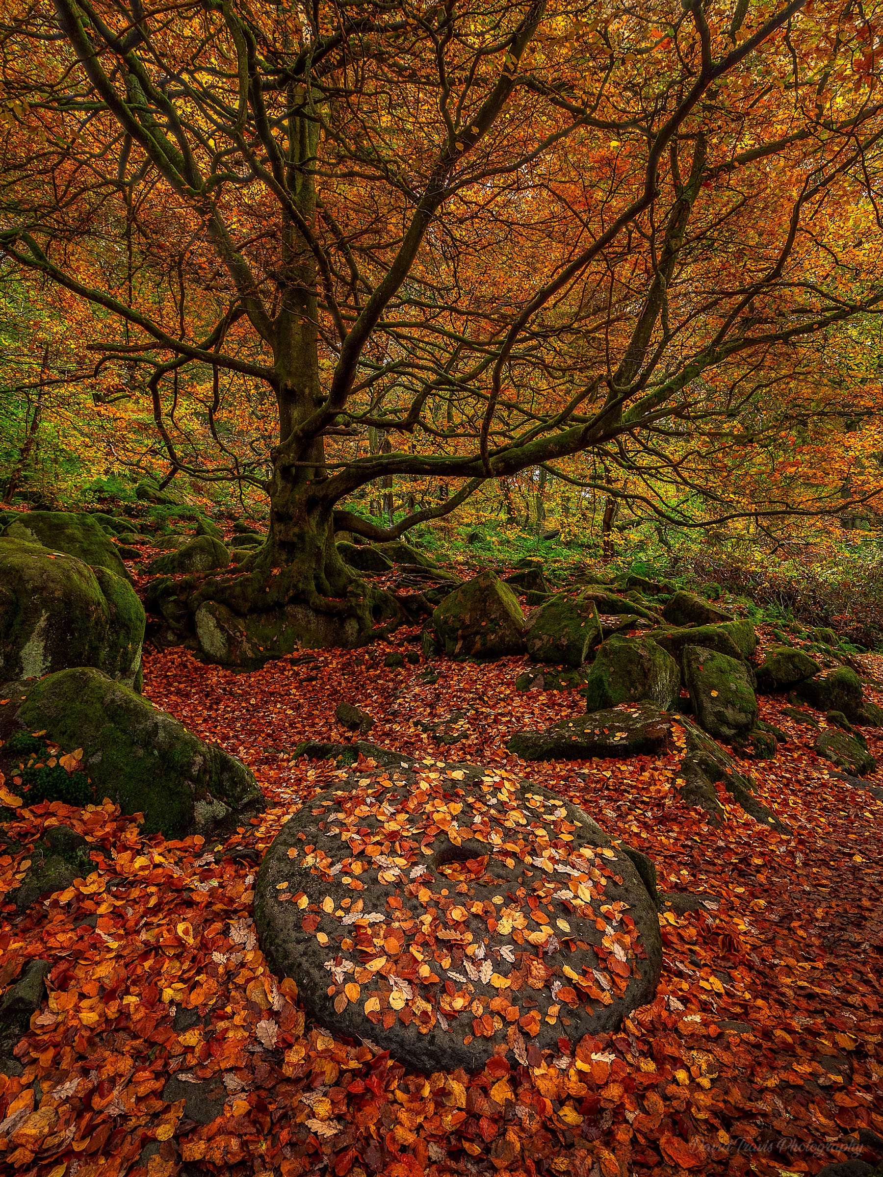 This is a classic shot of a millstone at Padley Gorge. I've photographed it in the past but this year I managed to get to Padley Gorge when Autumn was at its peak. If you blur your eyes, the picture looks like it's on fire.