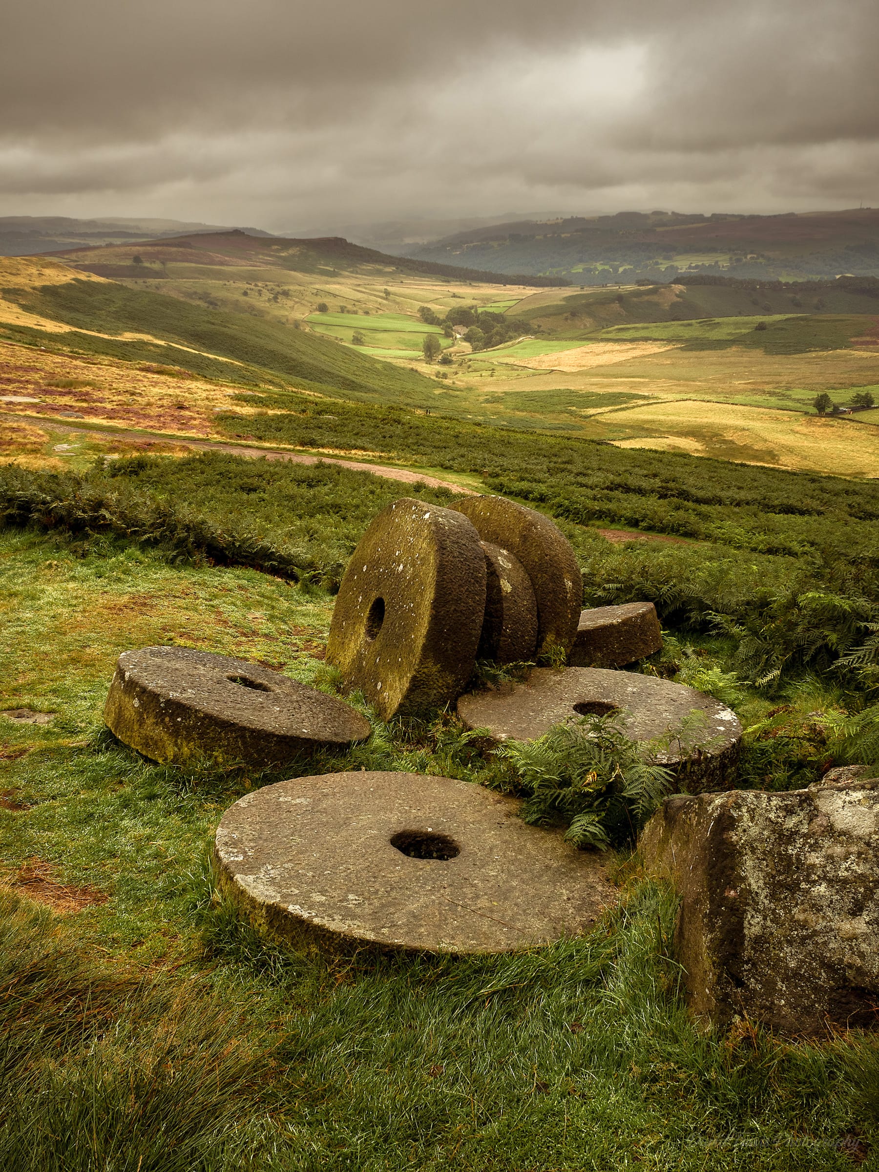I came across these millstones at Stanage Edge in August. A stone mason dug out and carved these two tonne monsters from the gritstone rocks nearby. He intended to transport them by road or river but he abandoned them here. Why? People's tastes changed. The gritstone turned flour grey and left bits of stone in the flour. People preferred the fine, white flour created from French millstones. French millstones also lasted longer and required less maintenance. So the bottom fell out of the market for Peak District millstones. Can you imagine creating these beasts and then finding that no-one wanted them?
