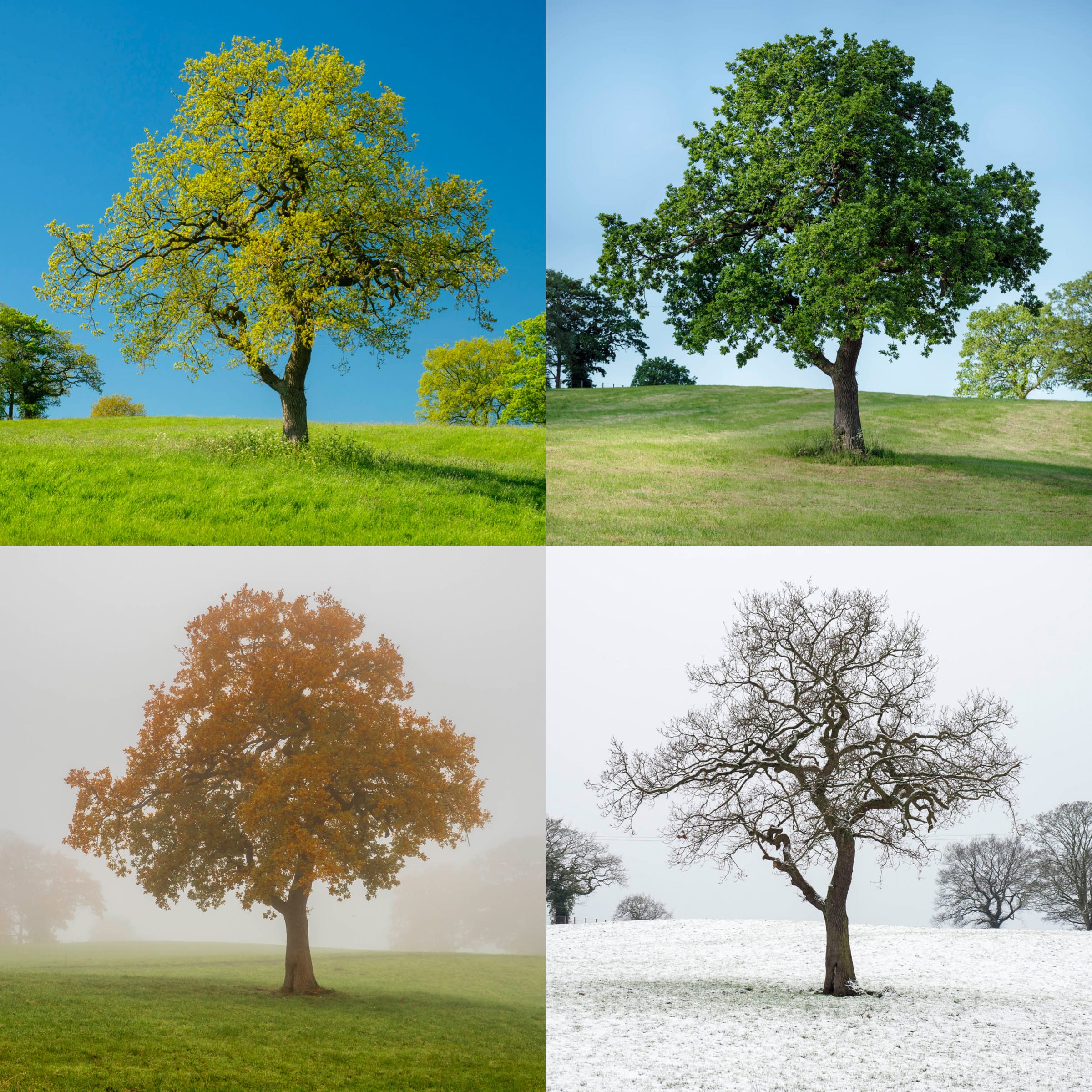 I first got the idea while photographing this oak tree over the seasons. The tree is a short walk from my house and I pass it most days while on a dog walk. That means I’ve been able to capture it at its peak in each season. Spring is the hardest to get the timing right. Oak trees have a bit of the avocado about them: not ripe, not ripe, not ripe, not ripe then BOOM!