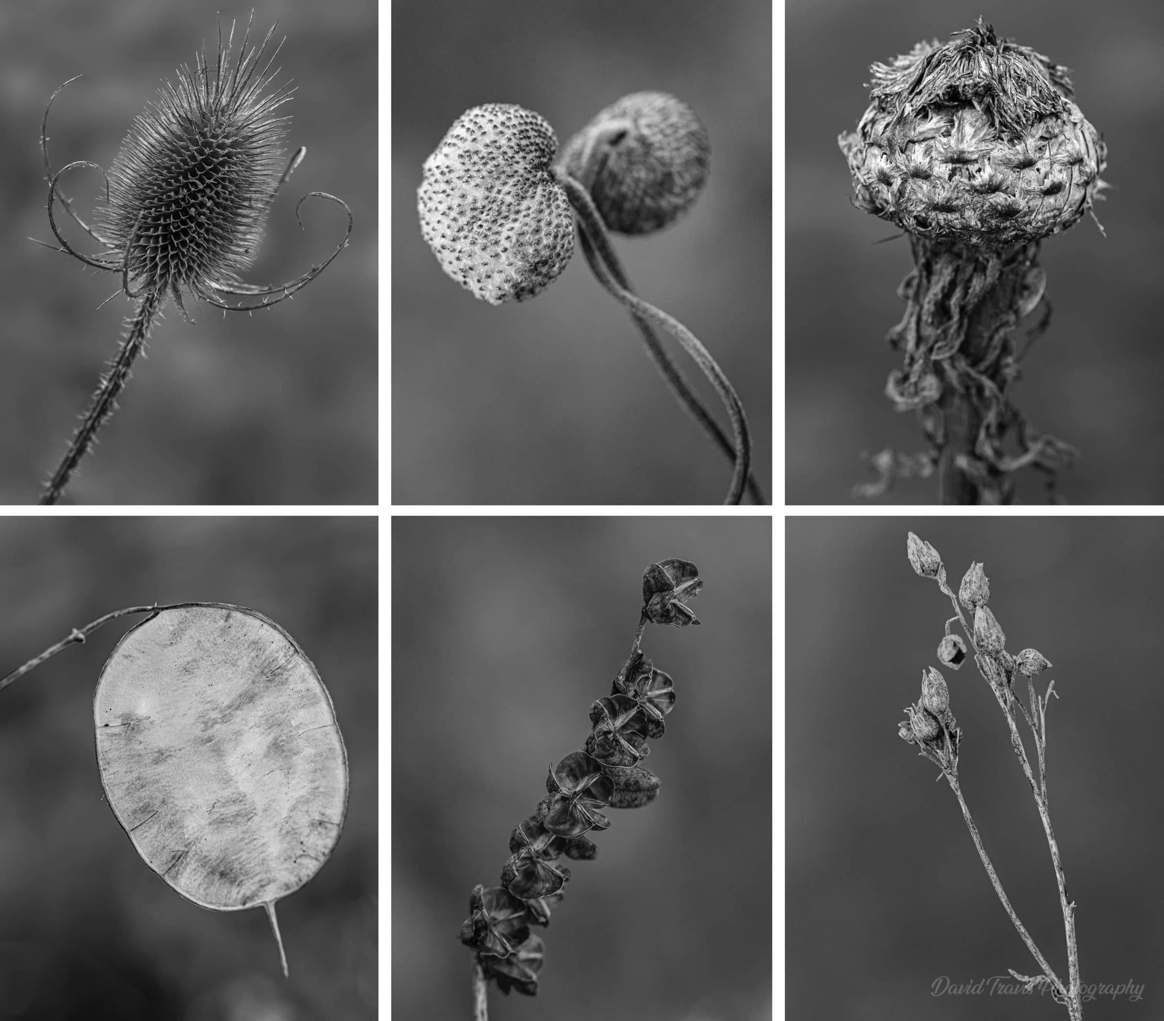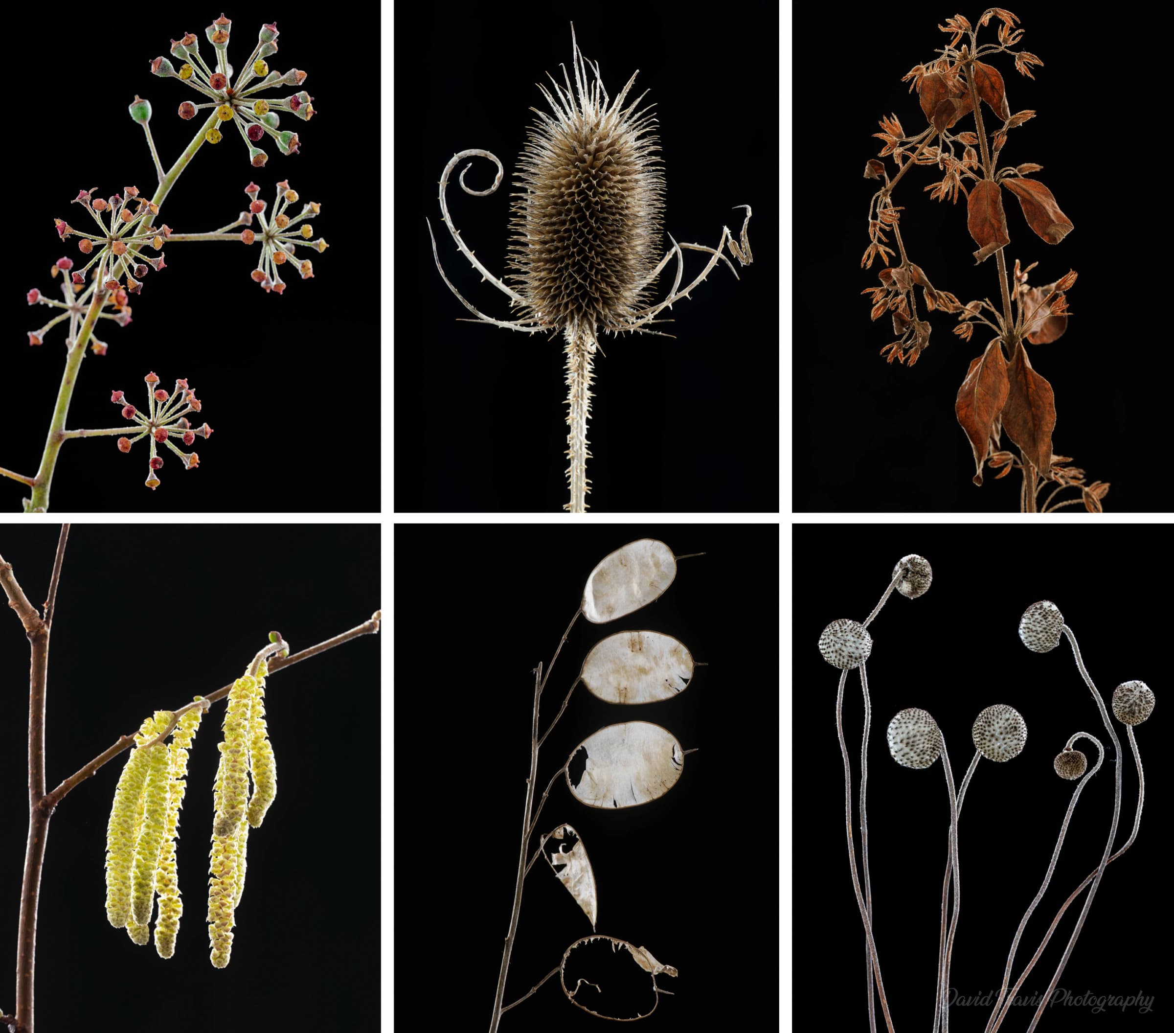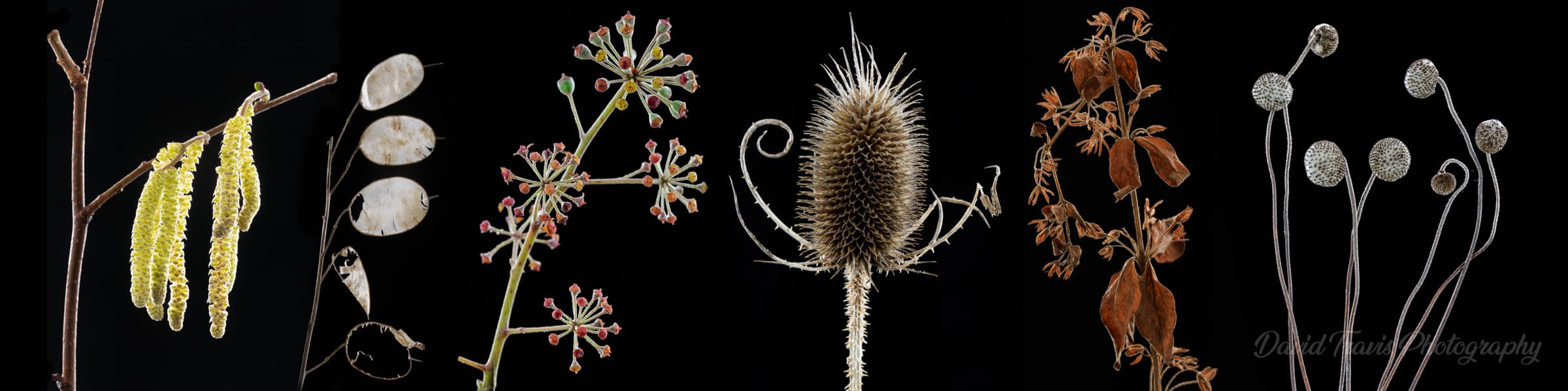 I made the second set in my home studio. I photographed the seed heads against a black background using studio flash, again to help draw attention to the subject. I didn't need to worry about wind, changing ambient light levels and the background clutter. Now I had control over light direction. I chose to use backlighting to reveal the delicate structure of the seed heads. Under studio lights, the colour of the seed heads stood out more so I kept these images in colour.